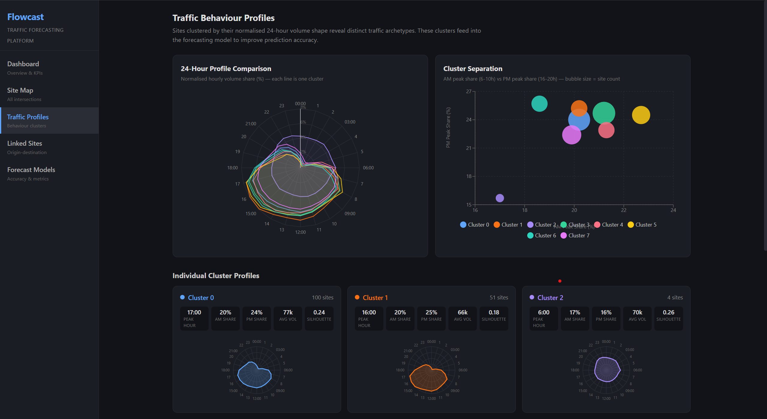 - Behavioral clustering — 8 intersection profiles visualized with radar and scatter charts